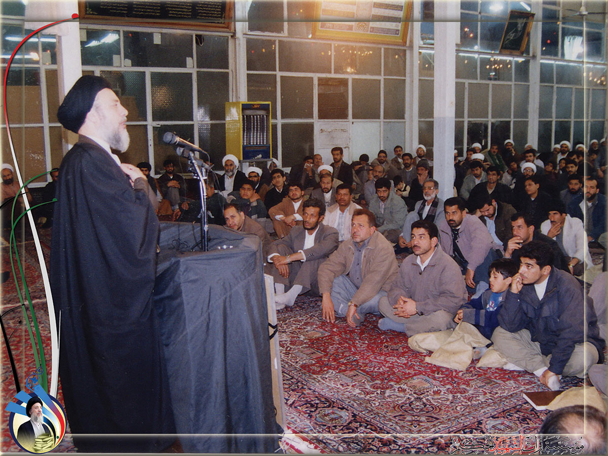 كلمة شهيد المحراب في النجف الأشرف مع كادر قسم شؤون المرأة في دار التبليغ الإسلامي عام 2003م.